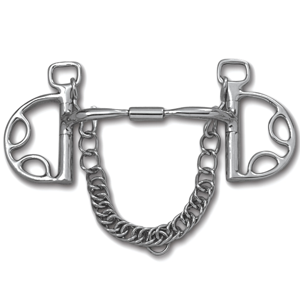 Notes: The mouthpiece is similar to the MB 02, but the center barrel of the MB 01 is narrower, which concentrates pressure on the center of the tongue more than the MB 02. For more tongue relief, step up to the MB 04. The Kimberwick is a “D” shaped stainless steel ring with a purchase for the headstall and two attachment options for a single pair of reins: the direct (snaffle) and the indirect (curb) positions. Comes with a curb chain. Like the Pelham, the purchase creates a fixed cheek so the bit is held in the correct position. The rider can choose the direct (snaffle) position or indirect (Curb) position for rein attachment. The Indirect Rein position adds very little to mild leverage. Designed to be used with only one pair of reins.