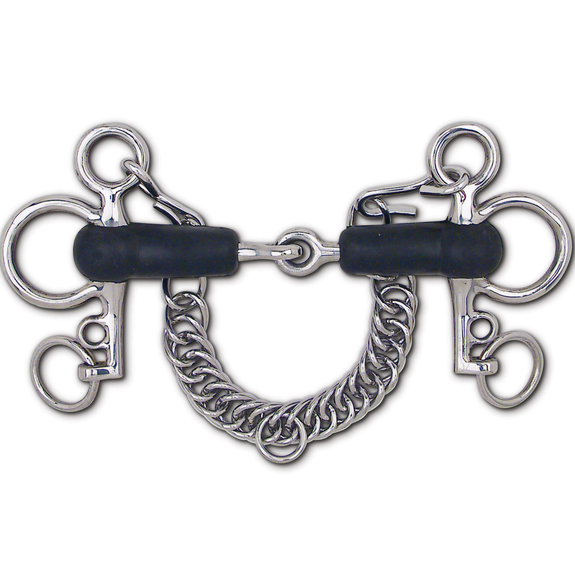 3 3/4" stainless steel tom thumb Pelham, soft rubber snaffle mouthpiece.